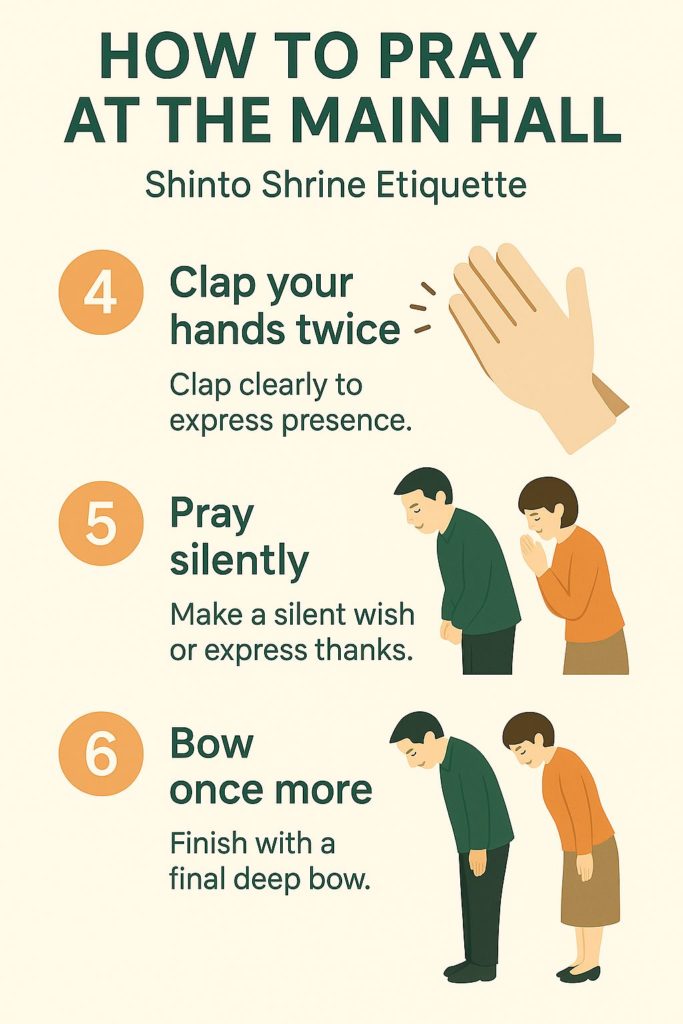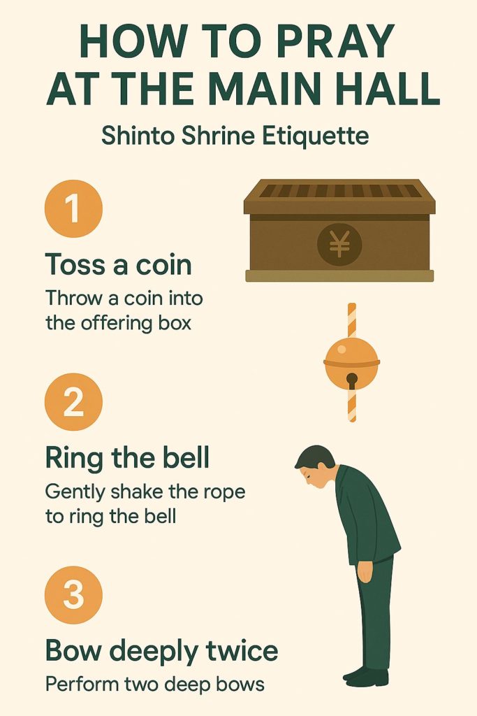 - If there’s a bell (suzu), gently ring it—it’s a way to call the deity’s attention before your prayer.