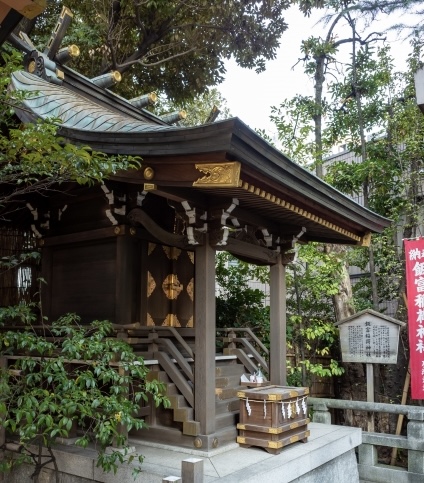 Within the precinct stands Iitomi Inari Shrine, dedicated to Inari Okami, the deity of prosperity. It was also deeply revered by the kabuki actor Ichikawa Danjuro IX, who prayed here for success in performing arts. Today, many artists and entertainers visit to seek blessings for their careers.